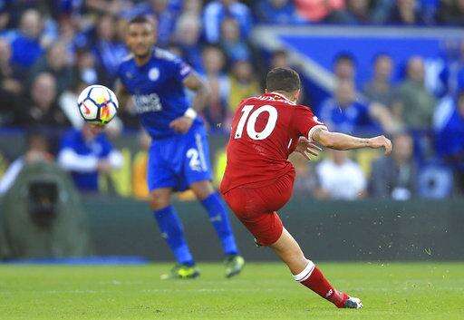 LEICESTER, England (AP) - Simon Mignolet's late penalty save secured a dramatic 3-2 victory for Liverpool over Leicester in the English Premier League on Saturday after Philippe Coutinho's brilliance put the Reds in control.