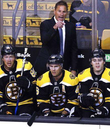 Boston Bruins head coach Bruce Cassidy calls to officials during the first period of a preseason NHL hockey game against the Detroit Red Wings in Boston, Tuesday, Sept. 19, 2017. (AP Photo/Charles Krupa) The Associated Press