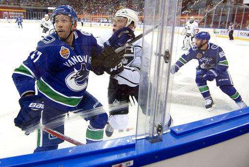 Vancouver Canucks' Sven Baertschi, left, and the Los Angeles Kings' Paul LaDue watch as the puck goes airborne during the second period of their NHL China exhibition game at the Cadillac Arena in Beijing, Saturday, Sept. 23, 2017. The Kings won 4-3 in a shootout. (AP Photo/Mark Schiefelbein)