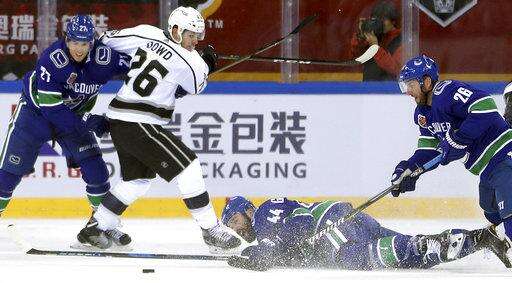 Vancouver Canucks' Erik Gudbranson loses his stick as he falls to the ice while battling for the puck with teammates Ben Hutton, left, and Thomas Vanek and The Los Angeles Kings' Nic Dowd during the second period of their NHL China exhibition hockey game at the Cadillac Arena in Beijing, Saturday, Sept. 23, 2017. The Kings won 4-3 in a shootout. (AP Photo/Mark Schiefelbein)