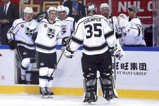 Members of the Los Angeles Kings celebrate with goalie Darcy Kuemper (35) after winning their NHL China exhibition game against the Vancouver Canucks at the Cadillac Arena in Beijing, Saturday, Sept. 23, 2017. The Kings won 4-3 in an overtime shootout. (AP Photo/Mark Schiefelbein)