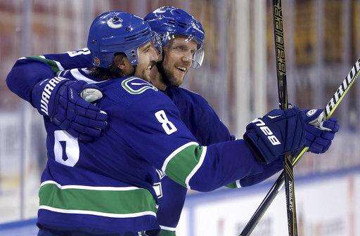 The Vancouver Canucks' Alex Edler celebrates after teammate Chris Tanev, foreground, scored a goal agains the Los Angeles Kings in the third period of their NHL China exhibition game at the Cadillac Arena in Beijing, Saturday, Sept. 23, 2017. The Kings won 4-3 in an overtime shootout. (AP Photo/Mark Schiefelbein)