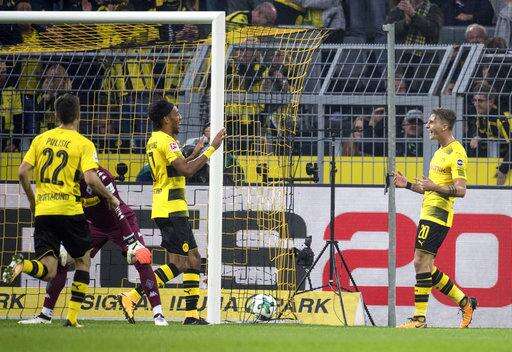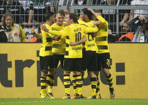 Dortmund's Pierre-Emerick Aubameyang, third left, celebrates with teammates after giving his side's 3:0 lead during the German Bundesliga soccer match between Borussia Dortmund and Borussia Moenchengladbach in the Signal Iduna Park stadium in Dortmund, Germany, Saturday, Sept. 23, 2017. (Bernd Thissen/dpa via AP) The Associated Press
