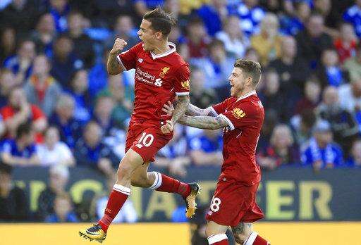 Liverpool's Philippe Coutinho, left, celebrates scoring his side's second goal of the game during the Premier League soccer match. Leicester City versus Liverpool at the King Power Stadium, Leicester, England, Saturday Sept. 23, 2017. (Mike Egerton/PA via AP) The Associated Press
