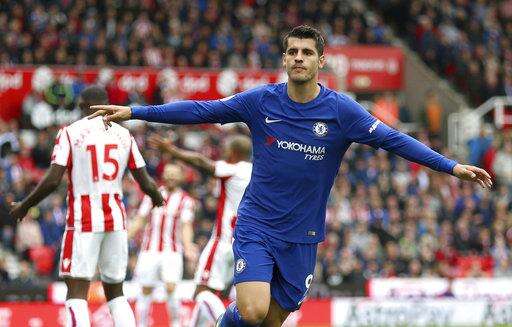 Chelsea's Alvaro Morata celebrates scoring his side's first goal of the game during the English Premier League soccer match between Stoke City and Chelsea at the bet365 Stadium, Stoke-on-Trent, England, Saturday, Sept. 23, 2017. (Nigel French/PA via AP) The Associated Press