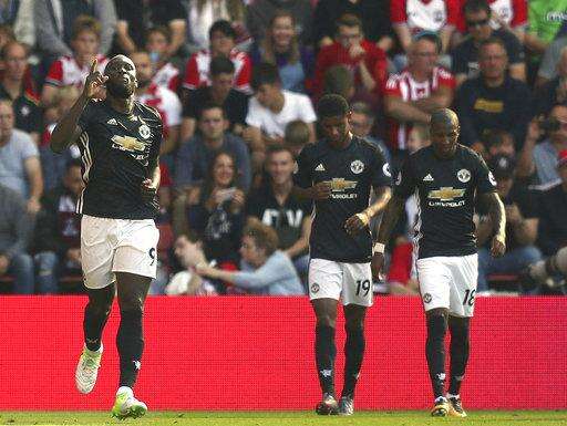 Manchester United's Romelu Lukaku, left, celebrates scoring his side's first goal of the game during their English Premier League soccer match against Southampton at St Mary's Stadium, Southampton, England, Saturday, Sept. 23, 2017. (Andrew Matthews/PA via AP) The Associated Press
