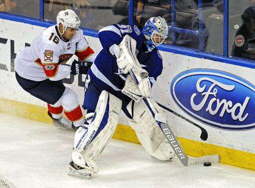 Tampa Bay Lightning goalie Peter Budaj clears the puck away from Florida Panthers forward Aleksander Barkov (16) during the third period of an NHL hockey game Sunday, Sept. 24, 2017, in Tampa, Fla. (AP Photo/Steve Nesius) The Associated Press