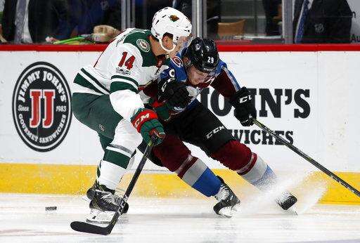 Minnesota Wild center Joel Eriksson Ek, left, checks Colorado Avalanche center Nathan MacKinnon as he loses the puck in the first period of a preseason hockey game, Sunday, Sept. 24, 2017, in Denver. (AP Photo/David Zalubowski) The Associated Press