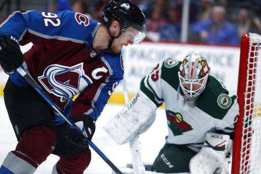 Colorado Avalanche left wing Gabriel Landeskog, front, of Sweden, redirects the puck at Minnesota Wild goalie Niklas Svedberg in the first period of a preseason hockey game, Sunday, Sept. 24, 2017, in Denver. (AP Photo/David Zalubowski) The Associated Press