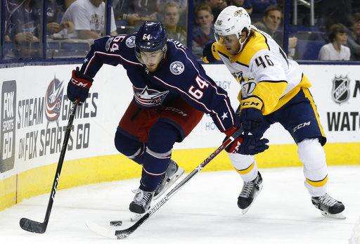 Columbus Blue Jackets' Tyler Motte, left, and Nashville Predators' Pontus Aberg, of Sweden, chase the puck during the second period of an NHL preseason hockey game Sunday, Sept. 24, 2017, in Columbus, Ohio. (AP Photo/Jay LaPrete) The Associated Press