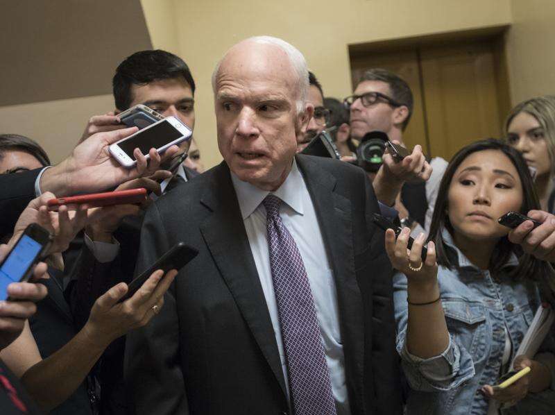 Sen. John McCain, an Arizona Republican, arrives at the Capitol for a weekly Republican policy meeting Tuesday in Washington, D.C. Looking at the twilight of his career and a grim cancer diagnosis, McCain, who prides himself on an independent streak, could not be moved to go along with the Graham-Cassidy bill. Associated Press