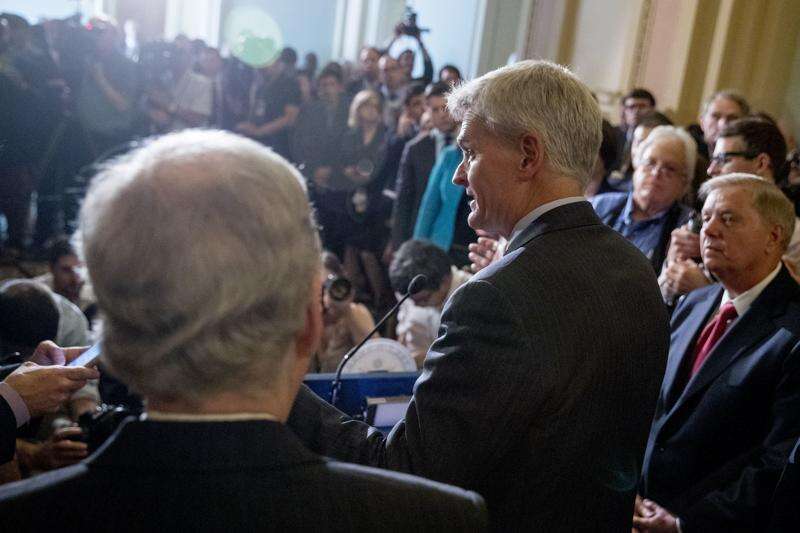 Sen. Lindsey Graham of South Carolina, flanked by Sen. Bill Cassidy of Louisiana, left, and Senate Majority Leader Mitch McConnell of Kentucky, right, speaks to reporters as Republicans faced assured defeat on the Graham-Cassidy bill, the GOP's latest attempt to repeal the Affordable Care Act on Tuesday in Washington, D.C. The decision marked the latest defeat on the issue for President Donald Trump and Senate Majority Leader Mitch McConnell in the Republican-controlled Congress. Associated Press