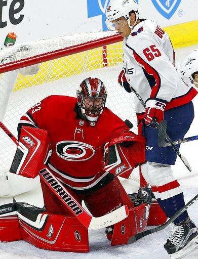 Carolina Hurricanes goalie Scott Darling (33) blocks a shot in front of Washington Capitals' Andre Burakovsky (65), of Austria, during the third period of an NHL hockey game, Friday, Sept. 29, 2017, in Raleigh, N.C. (AP Photo/Karl B DeBlaker)