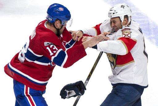 Montreal Canadiens center Peter Holland (13) and Florida Panthers center Derek MacKenzie (17) square off during the third period of an NHL hockey preseason game Friday, Sept. 29, 2017, in Montreal. (Paul Chiasson/The Canadian Press via AP)