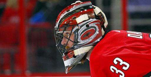 Carolina Hurricanes goalie Scott Darling (33) watches the action on the other side of the ice during the first period of an NHL hockey game against the Washington Capitals, Friday, Sept. 29, 2017, in Raleigh, N.C. (AP Photo/Karl B DeBlaker)