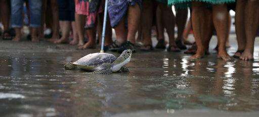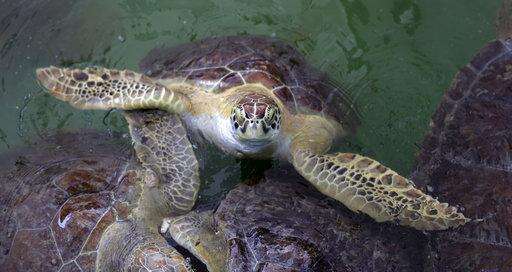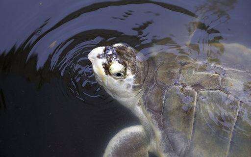 A sea turtle that had been held at the Animal Rehabilitation Keep in Port Aransas, Texas, swims in a tank at the Sea Life Center, Saturday, Sept. 30, 2017, in Corpus Christi, Texas. About 30 sea turtles, many awaiting surgery for tumors, were transferred after Hurricane Harvey destroyed the facility in Port Aransas. (AP Photo/Eric Gay) The Associated Press