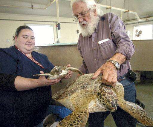 FILE - In this Jan. 11, 2010, file photo, Candice Mottet, left, and Tony Amos, director of the Animal Rehabilitation Keep in Port Aransas, Texas, hold the smallest and biggest green sea turtles that came ashore because of cold temperatures. (AP Photo/Corpus Christi Caller-Times, George Gongora, File) The Associated Press