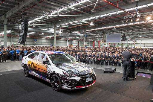 In this photo provided by Toyota Australia the last Toyota car produced in Australia is displayed for gathered workers in Melbourne, Tuesday, Oct. 3, 2017. Toyota closed its manufacturing plant in Melbourne, ending 54 years of production by the Japanese firm in Australia, the first country outside of Japan where the company made cars. (Toyota Australia via AP) The Associated Press