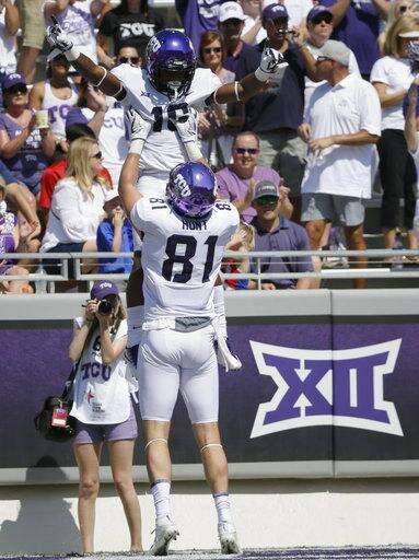 FILE - In this Sept. 16, 2017, file photo, TCU running back Kenedy Snell (16) celebrates his touchdown with teammate tight end Cole Hunt (81) during the first half an NCAA college football game against SMU in Fort Worth, Texas. While the Frogs are 4-0, with impressive road wins at Arkansas and then-No. 6 Oklahoma State in the last game before their open date, there is still a lot of unblemished white space on that pyramid of goals waiting to be shaded in purple. (AP Photo/LM Otero, File) The Associated Press