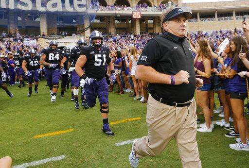 FILE- In this Sept. 2, 2017, file photo, TCU head coach Gary Patterson runs onto the field before an NCAA college football game against Jackson State in Fort Worth. While the Frogs are 4-0, with impressive road wins at Arkansas and then-No. 6 Oklahoma State in the last game before their open date, there is still a lot of unblemished white space on that pyramid of goals waiting to be shaded in purple. (Rodger Mallison/Star-Telegram via AP, File) The Associated Press