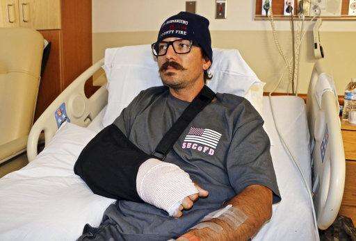 Mike Kordich, a firefighter from Rancho Cucamonga, Calif., answers questions from his hospital bed at Sunrise Hospital in Las Vegas, Tuesday, Oct. 3, 2017. Kordich was giving a severely injured person CPR when he was hit by a bullet after a gunman opened fire on an outdoor music concert on Sunday. (AP Photo/Robert Ray) The Associated Press
