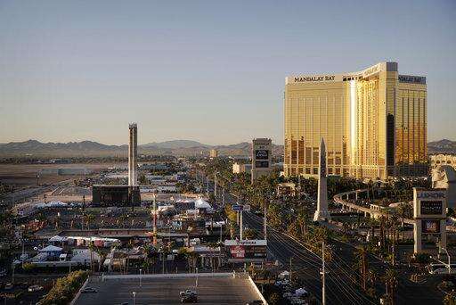 The Mandalay Bay resort and casino, right, overlooks an outdoor festival grounds across the street, left, Tuesday, Oct. 3, 2017, in Las Vegas. Authorities said Stephen Craig Paddock broke the windows on the casino and began firing with a cache of weapons, killing dozens and injuring hundreds at a music festival at the grounds. (AP Photo/John Locher) The Associated Press