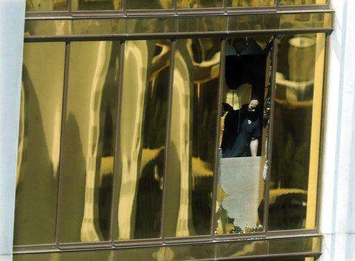 An investigator works in the room at the Mandalay Bay Resort and Casino where a gunman opened fire from on a music festival Tuesday, Oct. 3, 2017, in Las Vegas. The gunman killed dozens and injuring hundreds at the festival. (AP Photo/Marcio Jose Sanchez) The Associated Press