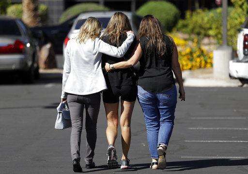 Kris Delarosby, right, and Colleen Anderson, left, hold Charleen Jochim, center, as they walk towards a hospital in search of information on a missing friend, Steven Berger of Minnesota, Tuesday, Oct. 3, 2017, in Las Vegas. The parents of Berger, who had been missing after the mass shooting in Las Vegas, say they have been notified on Tuesday afternoon that he was killed in the attack. (AP Photo/Gregory Bull) The Associated Press