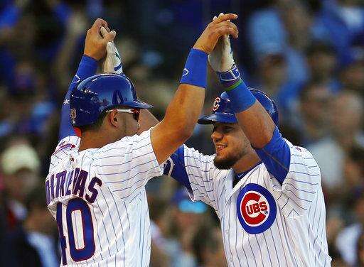Chicago Cubs' Kyle Schwarber, right, celebrates with teammate Willson Contreras after hitting a two-run home run against the Cincinnati Reds during the second inning of a baseball game Saturday, Sept. 30, 2017, in Chicago. (AP Photo/Jim Young) The Associated Press