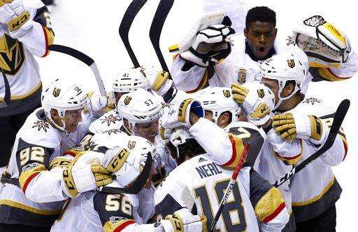 Vegas Golden Knights left wing James Neal (18) celebrates his game-winning goal against the Arizona Coyotes with Golden Knights left wing Tomas Nosek (92), left wing David Perron (57), left wing Erik Haula (56), left wing Pierre-Edouard Bellemare (41), and others during overtime of an NHL hockey game Saturday, Oct. 7, 2017, in Glendale, Ariz. The Golden Knights defeated the Coyotes 2-1. (AP Photo/Ross D. Franklin) The Associated Press