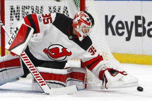 New Jersey Devils goalie Cory Schneider (35) covers the puck during the first period of an NHL hockey game against the Buffalo Sabres, Monday Oct. 9, 2017, in Buffalo, N.Y. (AP Photo/Jeffrey T. Barnes) The Associated Press