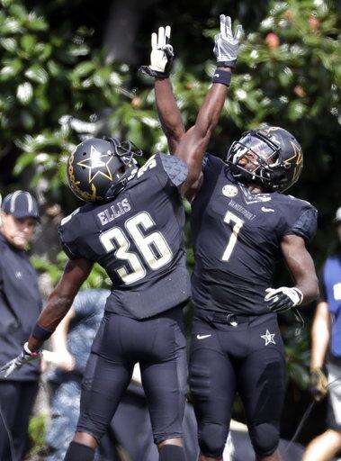 Vanderbilt running back Ralph Webb (7) celebrates with wide receiver Trey Ellis (36) after Webb scored a touchdown against Georgia in the first half of an NCAA college football game Saturday, Oct. 7, 2017, in Nashville, Tenn. (AP Photo/Mark Humphrey) The Associated Press