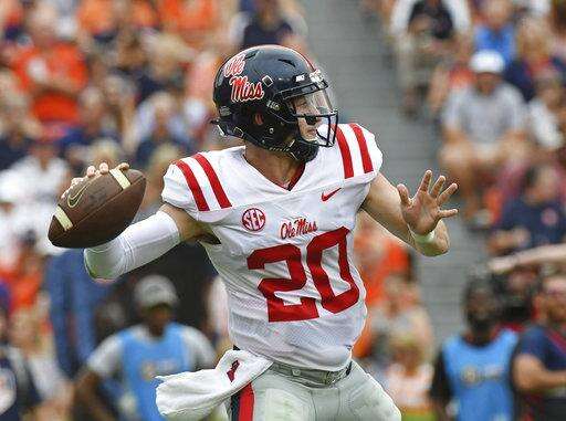 Mississippi quarterback Shea Patterson (20) releases a pass during the first half of an NCAA college football game against Auburn in Auburn, Ala., Saturday, Oct. 7, 2017. (AP Photo/Thomas Graning) The Associated Press