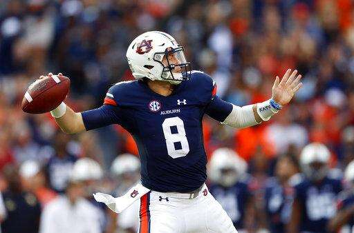 FILE - In this Sept. 20, 2017, file photo, Auburn quarterback Jarrett Stidham (8) throws a pass against Mississippi State during the first half of an NCAA college football game, in Auburn, Ala. No. 10 Auburn's offense has made huge strides since the Clemson game with the progress of quarterback Jarrett Stidham and the touchdown tear of tailback Kerryon Johnson. (AP Photo/Butch Dill, File) The Associated Press