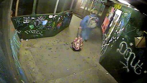 Prosecutors introduced footage showing a man believed to be Rahimi walking on the street with a backpack and two rolling duffle bags before sitting on the steps of a church just prior to the blast.