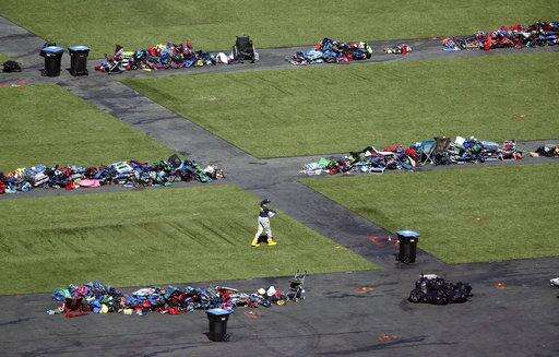 FILE - In this Oct. 3, 2017, file photo, investigators work among thousands of personal items at a festival grounds across the street from the Mandalay Bay Resort and Casino in Las Vegas. Friends and relatives of the victims and other concert-goers who survived returned Monday, Oct. 9, 2017, to reclaim baby strollers, shoes, phones, backpacks and purses left behind in the panic as they fled, at a Family Assistance Center at the Las Vegas Convention Center. (AP Photo/Marcio Jose Sanchez, File) The Associated Press