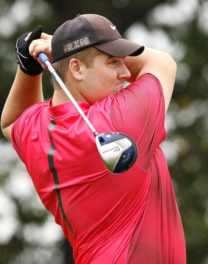Naperville North's Carl Christiansen reacts to his 7th-hole tee shot during the Naperville Central boys golf regional at Naperbrook Golf Course. Daniel White/dwhite@dailyherald.com