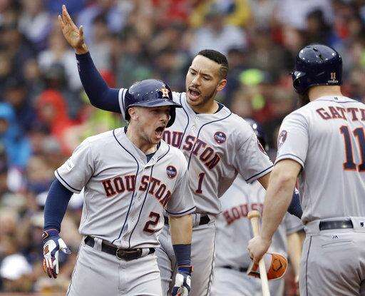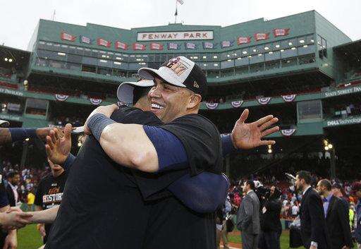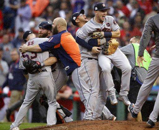 BOSTON (AP) - The Houston Astros poured back onto the field after advancing to their first AL Championship Series, posing for pictures with the Green Monster as a backdrop before a few players bellyflopped in the puddles in the infield dirt.