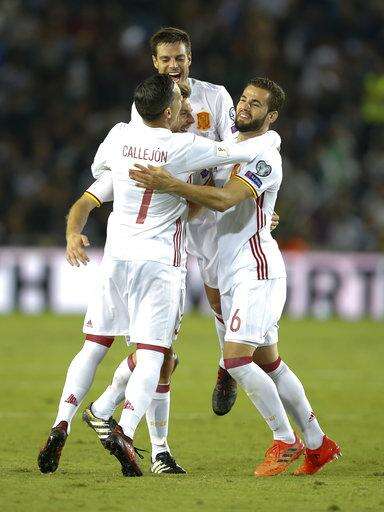Spanish players celebrate after they scored against Israel during the World Cup Group G match in Jerusalem, Monday, Oct.9, 2017. (AP Photo/Ariel Schalit) The Associated Press