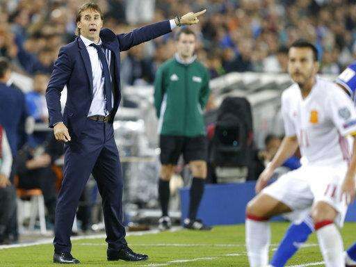 Spain's,coach Julen Lopetegui shouts instructions and during a World Cup Group G match against Israel in Jerusalem, Monday, Oct.9, 2017. (AP Photo/Ariel Schalit) The Associated Press