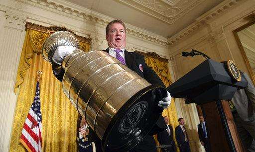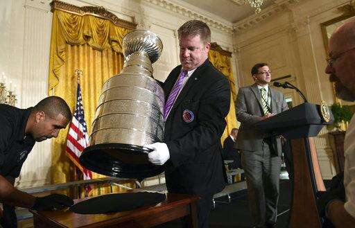 Mike Bolt holds the Stanley Cup near where is will be displayed in the East Room of the White House in Washington, Tuesday, Oct. 10, 2017, in preparation for a visit by the 2017 NHL Stanley Cup Champion Pittsburgh Penguins with President Donald Trump. Bolt is one of the four keepers of the Cup, whose job it is to protect the 35-pound, silver trophy that has nearly three thousand names engraved on the bands that surround it. (AP Photo/Susan Walsh) The Associated Press