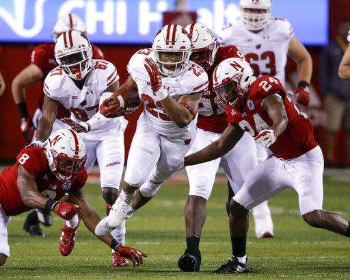 FILE - In this Saturday, Oct. 7, 2017, file photo, Wisconsin running back Jonathan Taylor (23) carries the ball past Nebraska defensive back Chris Jones (8) and defensive back Aaron Williams (24) during the second half of an NCAA college football game in Lincoln, Neb. With a career-high 249 yards last week against Nebraska, Wisconsin running back Jonathan Taylor became the second true freshman in program history with multiple 200-yard rushing games. (AP Photo/Nati Harnik, File) The Associated Press