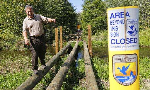 In this Wednesday, Sept. 13, 2017 photo, Chris Lowie, left, refuge manager Great Dismal Swamp National Wildlife Refuge, walks along a walkway after talking with volunteer Jim Seagraves, right, as they look over the construction of a walkway in the swamp in Suffolk, Va. The U.S. Fish and Wildlife Service is trying to undo the damage by gradually ârewettingâ the swamp. Lowie and his staff are slowly raising the water table in the swampâs remaining 113,000 acres by capturing and rechanneling rainfall in the vast network of ditches that scar the land. (AP Photo/Steve Helber)