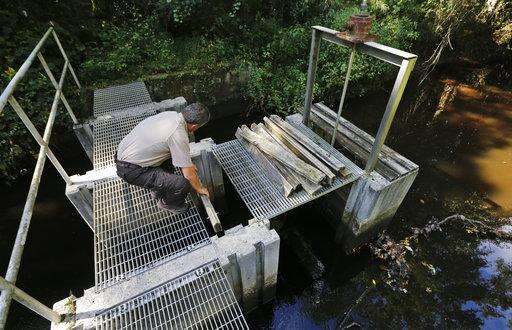 In this Wednesday, Sept. 13, 2017 photo, Chris Lowie, refuge manager Great Dismal Swamp National Wildlife Refuge, adjusts a board on a water control structure along The Washington Ditch in the swamp in Suffolk, Va. The U.S. Fish and Wildlife Service is trying to undo the damage by gradually ârewettingâ the swamp. Lowie and his staff are slowly raising the water table in the swampâs remaining 113,000 acres by capturing and rechanneling rainfall in the vast network of ditches that scar the land. (AP Photo/Steve Helber)