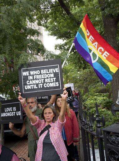 People gather at the Stonewall National Monument to watch as the Rainbow Flag flies beneath the American flag, Wednesday, Oct. 11, 2017, in New York. The Rainbow Flag, an international symbol of LGBT liberation and pride, was hoisted on a flagpole for the first time at the monument. (AP Photo/Mark Lennihan) The Associated Press