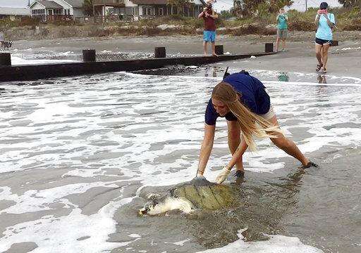 In this Monday, Oct. 9, 2017, photo provided by the South Carolina Aquarium, Willow Melamet, South Carolina Aquarium Sea Turtle Care Center manager helps "Peach," a 55 pound (25 kilogram) female Kemp's ridley turtle, into the ocean in Folly Beach, S.C. Peach was released to the Atlantic Ocean after surgery to remove more than 4 feet (1 meter) of fishing line she had swallowed. (Danielle Raub/South Carolina Aquarium via AP)