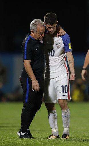 United States' Christian Pulisic, right, is comforted by a member of the team staff after the U.S. lost to Trinidad and Tobago in their World Cup qualifying match, at Ato Boldon Stadium in Couva, Trinidad and Tobago, Tuesday, Oct. 10, 2017. (AP Photo/Rebecca Blackwell) The Associated Press