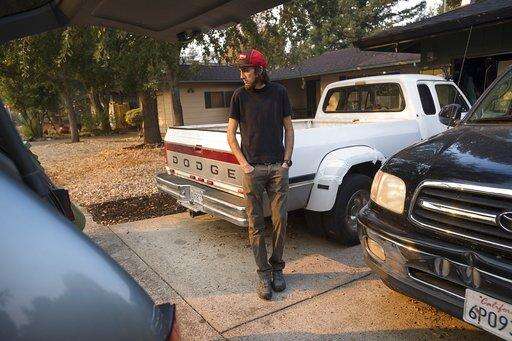 Marshall Hayman, 26, and his family stay after a mandatory evacuation order issued on Wednesday, Oct. 11, 2017, in Calistoga, Calif. He lost his home in Calistoga on the first day of the fire. Three days after the fires began, firefighters were still unable to gain control of the blazes that had turned entire Northern California neighborhoods to ash and destroyed thousands of homes and businesses. (Paul Kitagaki Jr./The Sacramento Bee via AP)