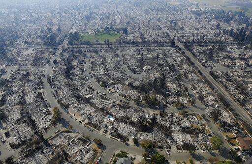 Aerial view show the scope of devastation in the Coffey Park neighborhood of Santa Rosa, California, Wednesday, Oct. 11, 2017. (Karl Mondon /San Jose Mercury News via AP)