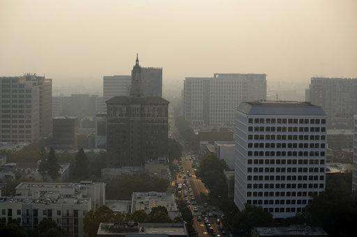 The view of the downtown San Jose, Calif., is filled with a smoky haze seen from the 18th floor of San Jose City Hall Wednesday, Oct. 11, 2017. Officials say they have thousands of firefighters battling almost two dozen blazes burning in Northern California and that more are coming from nearby states. (Josie Lep/San Jose Mercury News via AP)